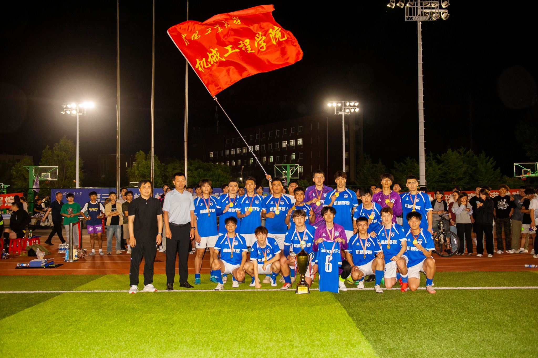 比赛结束后举行颁奖仪式。党委常委、副校长孙秋野为获奖队伍和个人颁发了奖杯、奖牌和证书。机械工程学院荣获冠军,建筑与土木工程学院和材料科学与工程学院分获亚军和季军;电气科学与工程学院、理学院、管理学院、信息科学与工程学院、辽阳分校分获4至8名。此外,人工智能学院、电气工程学院获得体育道德风尚奖;信息科学与工程学院仲梓丞、机械工程学院依克获“最佳学生裁判员”称号,机械工程学院杨紫鑫获“最佳球员”称号,材料科学与工程学院萨地克以8粒进球荣膺“最佳射手”称号。